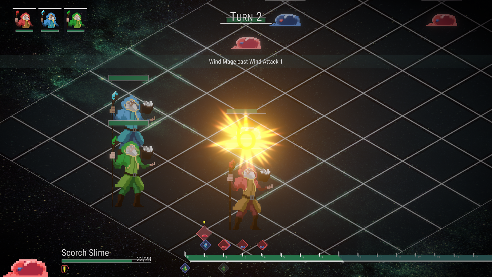 When a character takes action, they can use skills, which all have costs. The costs of a skill determine how many slots the character will move on the order timeline after using it. Characters can continuously use skills until they have moved from the “current timeline” to “next timeline”, which means that the total accumulated costs used exceeds over 7. Once all characters on the “current timeline” have moved to the “next timeline,” this turn is now ended. The “next timeline” will shift all of the characters to “current timeline,” then starting the next turn.