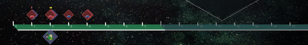 The order timeline consists of 16 slots from 0 to 15, which are divided into the light green “current timeline” on the left and the dark green “next timeline” on the right. All characters on the field are displayed on the order timeline, and the character at the bottom represents the current active character. If there are characters remaining on the “current timeline,” they’ll all be moved toward left until the first slot(slot 0) is occupied by any actionable character. If there are more than one characters in the first slot (slot 0), the order is determined based on the last-in, first-out(LIFO) rule.
