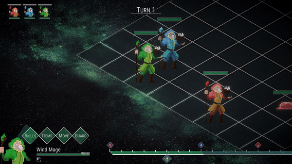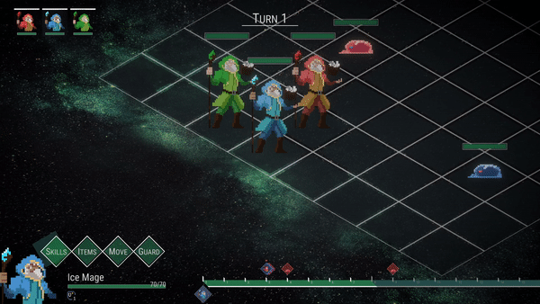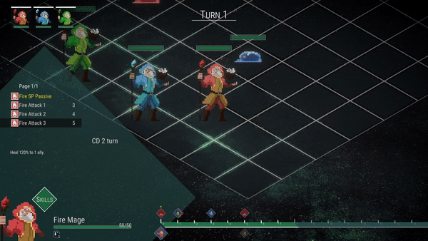 - Skill: Players can pick an available skill to use. Each skill has a cooldown (CD), which means that there need to wait several turns before it can be used again after being used once.