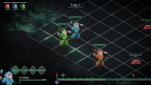 - Move: Player can move to any tile one time per turn. This feature is not fully completed, and moving will play a significant role in the Boss battle in the future.