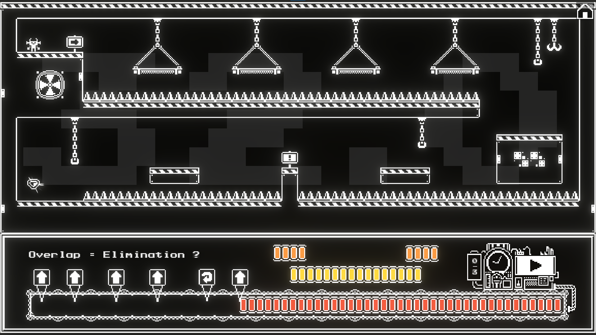 At the start of each level, you will have several blocks. A yellow block means the timer will double in speed, while an orange block means the timer will run at half speed. After placing all the blocks on the action bar, you can click the machine to see how the bot executes its actions. If the bot reaches the diamond, you win.